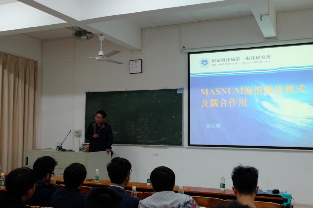 上午,两位专家与学院张书文经理、徐建军教授、凌征研究员在海博楼会议室就“海洋上层混合过程参数化及实验验证”课题进行研讨,对课题进展提出了很多宝贵的意见。下午,侯一筠研究员与杨永增研究员在第二教学楼B1202分别作学术报告,报告厅座无虚席,学院100余名教师、研究生和本科生现场聆听了报告。侯一筠研究员在所做的题为《全球气候变化下的海气耦合系统》的报告中指出了海洋动力研究的重要性与实用性,并由浅到深的介绍了当前背景下的海气耦合系统;杨永增研究员则做了题为《MASNUM海浪数值模式及耦合作用》的报告,系统介绍了MASNUM海浪数值模式的定位、发展目标与应用。