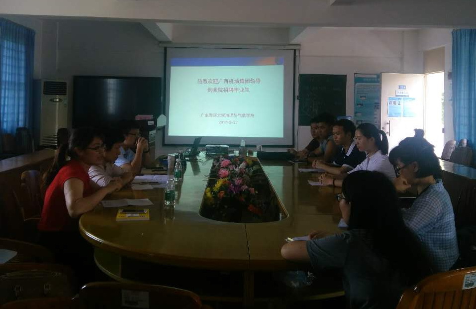 2017年5月23日下午,广西机场集团公司属下的百色机场和北海机场一行三人到william威廉中文官网海博楼二楼学术报告厅对2017届大气科学毕业生进行面试。