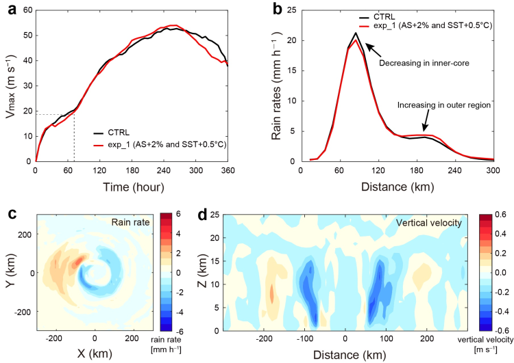 Nature Communication发表的论文中,科研人员基于卫星降雨资料和理想模式模拟结果分析了1999至2018年全球热带气旋降水率变化及其可能原因,认为近20年台风平均降雨率(包括台风的内核和外部区域)约增加了8%,平均每十年增速约为每小时0.11毫米(正负0.05毫米)。这主要是气温升高导致大气中水汽含量增加,为台风外围区域的雨率增加提供了有利条件。