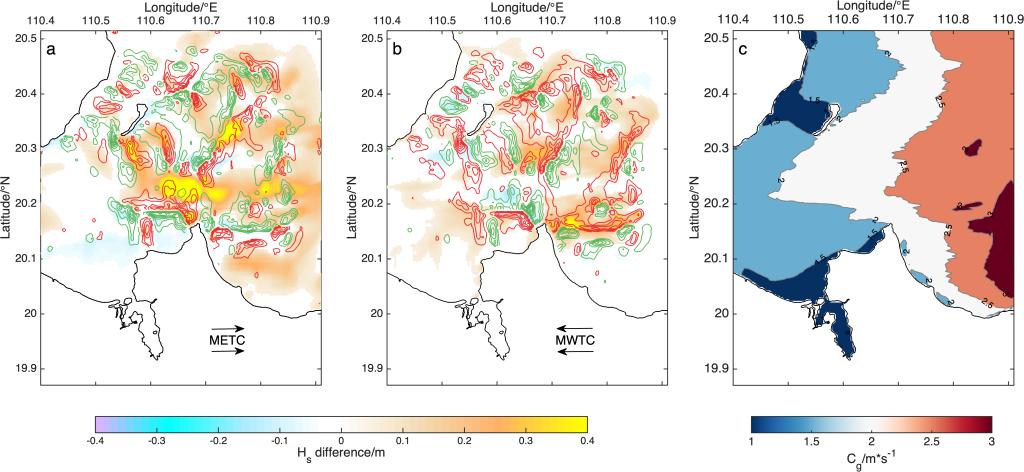 图2. (a)东向最大潮流的散度场(红色等值线标识辐聚,绿色等值线标记辐散)及其在琼州海峡东口处引发的有效波高变化(填色);(b)同(a),但为西向最大潮流作用下情形;(c)波浪群速度分布。注:(a)、(b)中有效波高变化在0.05m以内的区域未绘制。