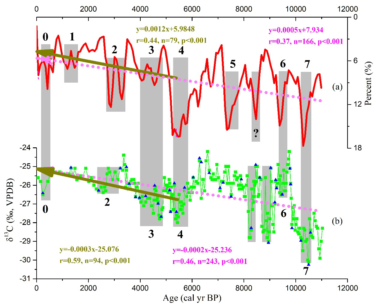 图2 阿勒泰泥炭纤维素δ13C记录与北大西洋冰伐记录对比分析