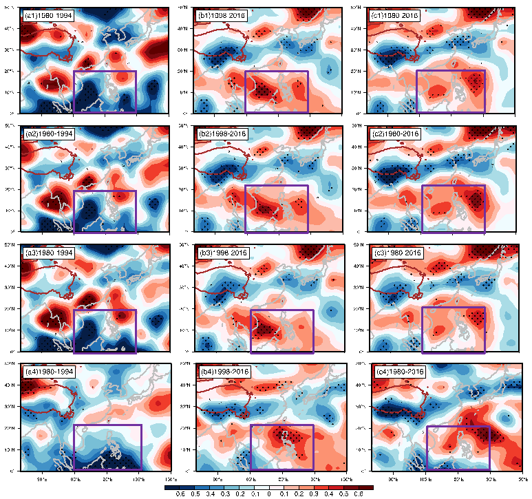 图1. TPST与GPCP的标准化偏回归系数:(a) 1980-1994年,(b) 1998-2016年,(c) 1980-2016年。1:台站资料,2: JRA55, 3: ERA5, 4: ERA-Interim资料。紫色区域代表本文研究的南海。Student’s t–test黑点表示通过90%信度检验。