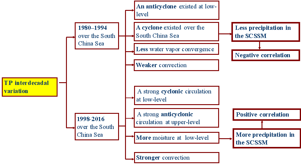 在近三十几年青藏高原表层气温快速增暖的背景下,青藏高原东部夏季的气温(TPST)在1996年前后存为显著的年代际变化。该研究记录了青藏高原夏季地表温度与南海夏季风降水(SCSSMP)关系的变化。采用逐步回归模型排除了全球变暖因子、厄尔尼诺-南方涛动(ENSO)、西北太平洋副热带高压(WNPSH)、大西洋多年代际涛动(AMO)和太平洋十年代际涛动(PDO)等信号。结果表明,TPST-SCSSMP关系随时间变化,从1980-1994年为负相关关系,到1998-2016年为明显的正相关关系。同时,TPST与东亚副热带锋(梅雨)的负相关关系在1998-2016年增强。这种TPST - SCSSMP关系的变化与大气环流的变化有关,这主要是由于TPST的年代际变化所致。波列在低纬度沿着低级季风流向东移动,强大的气旋环流明显在西南高原的一部分,包括印度支那半岛,南中国海,菲律宾以东和海洋,这也与TPST和向外长波辐射(OLR)之间的负相关相一致。水汽辐合增多,对流条件更加有利,导致90年代后期以后该地区降水增多。目前的结果表明,在变化的气候背景下,在使用具有年代际变化的预测指标时应当注意。