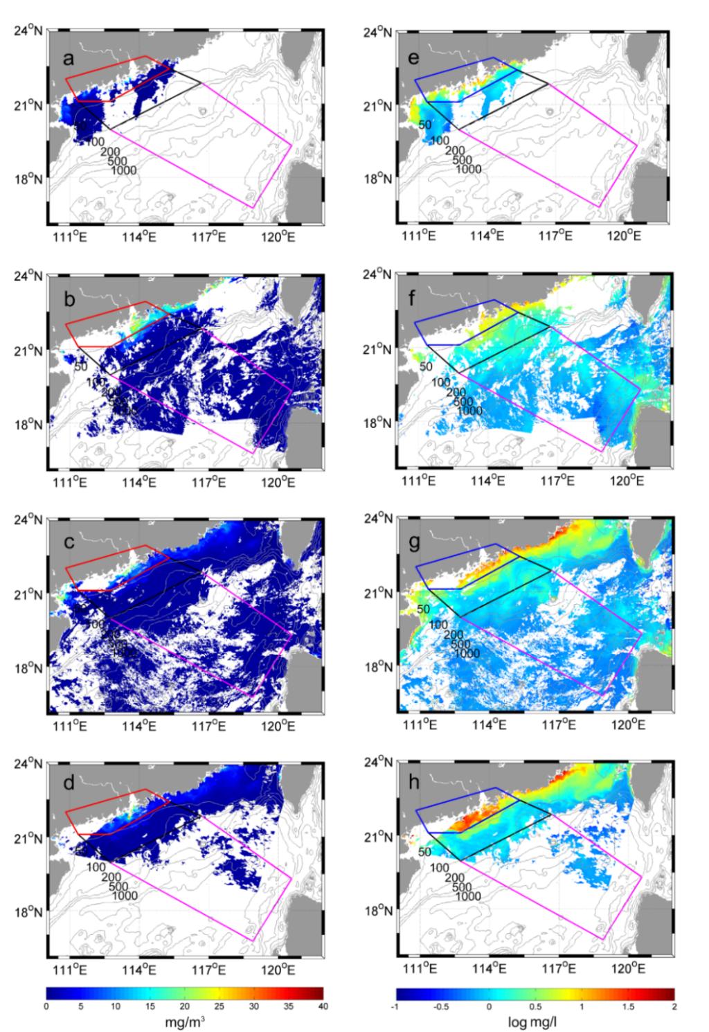 图1. 悬浮物浓度(a-d)与叶绿素a浓度(e-h)在2018年9月15,18,20与21日的空间分布。颜色的框线划分出了近岸、陆架及外海三个研究区域。数值为等深线。