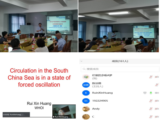 9月23日晚,黄瑞新教授应邀在腾迅会议线上作了题为“Circulation in South China Sea is a state of forced circulation”的报告。会上,针对南海环流的热点问题,黄瑞新教授利用理想封闭模式模拟了南海环流,指出由于南海海盆尺度较小,罗斯贝调整不充分导致南海环流呈现扰动强迫的特征,学术报告加深了广大师生对南海环流的认识,提供了关于南海环流研究的新思路,报告内容丰富,科研思路严谨,参会师生表示受到了极大的启发。