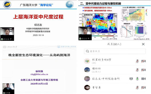10月14日下午,william威廉中文官网举行了第九期海学论坛,这次论坛有幸邀请到了中科院南海海洋研究所的经志友研究员以及合肥工业大学资源与环境工程学院的徐利强副教授。论坛由经理谢玲玲主持,海洋科学系的孔德明老师从旁协助,采用线上进行的方式,学院及学校部分师生参会人数共80余人。