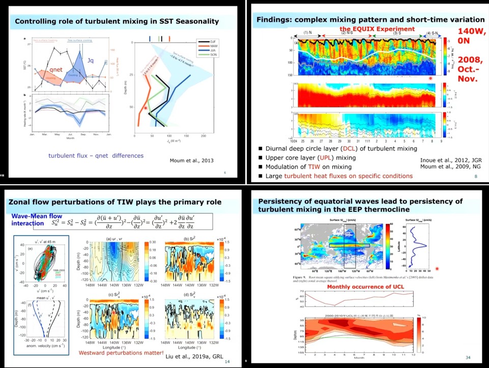 第一部分介绍了赤道温跃层的小尺度混合观测及意义。一是在季节变换上,混合会对赤道区域SST的季节变化起控制作用;二是在年际变化上,湍流混合对ENSO循环具有正反馈作用。