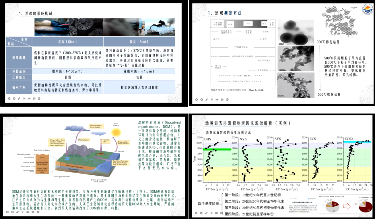 在第一部分,林老师为我们揭晓了黑碳的来源,并指出黑碳难降解不代表其不降解,自然环境中的黑碳降解转化无疑会引发连锁效应。随后,林老师就“黑碳的来源辨识和通量计算”问题展开讲解,并指出黑碳降解转化对溶解有机质(DOM)的影响以及对有机污染物、重金属的吸附-解吸附的影响。