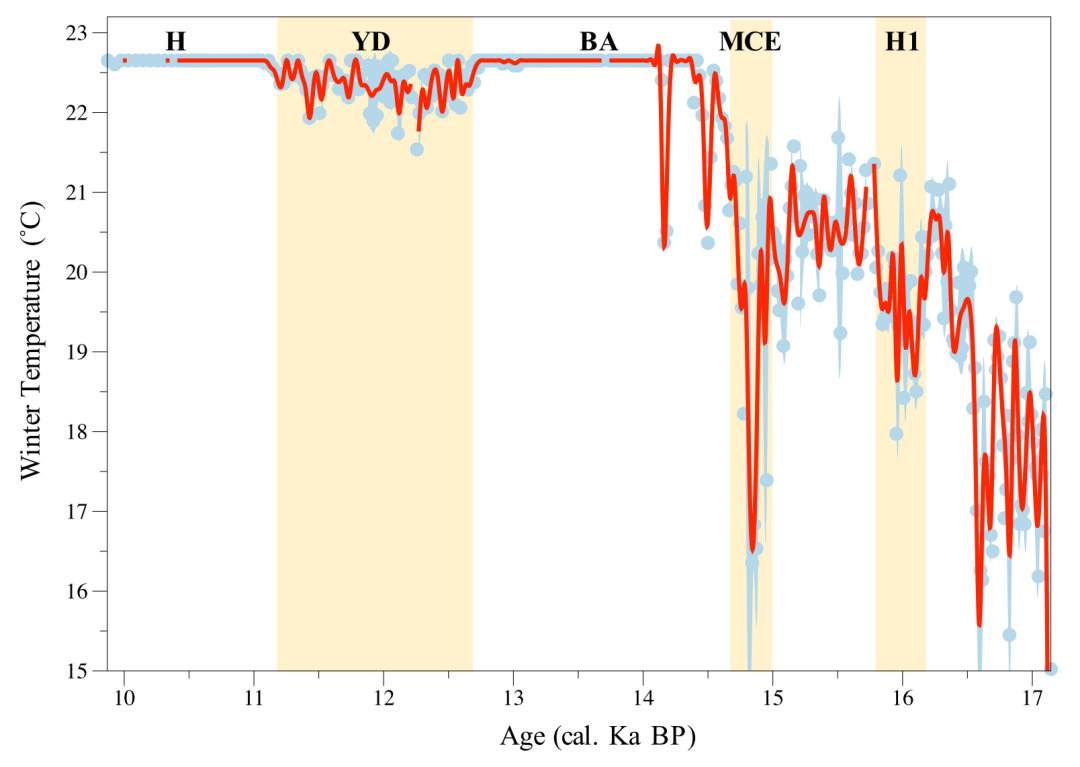 图1 湖光岩玛珥湖硅藻重建的末次冰消期冬季温度变化历史(H:全新世,YD:新仙女木降温事件,BA:Bølling-Allerød增温事件,MCE:大融水降温事件,H1:哈因里奇降温事件)