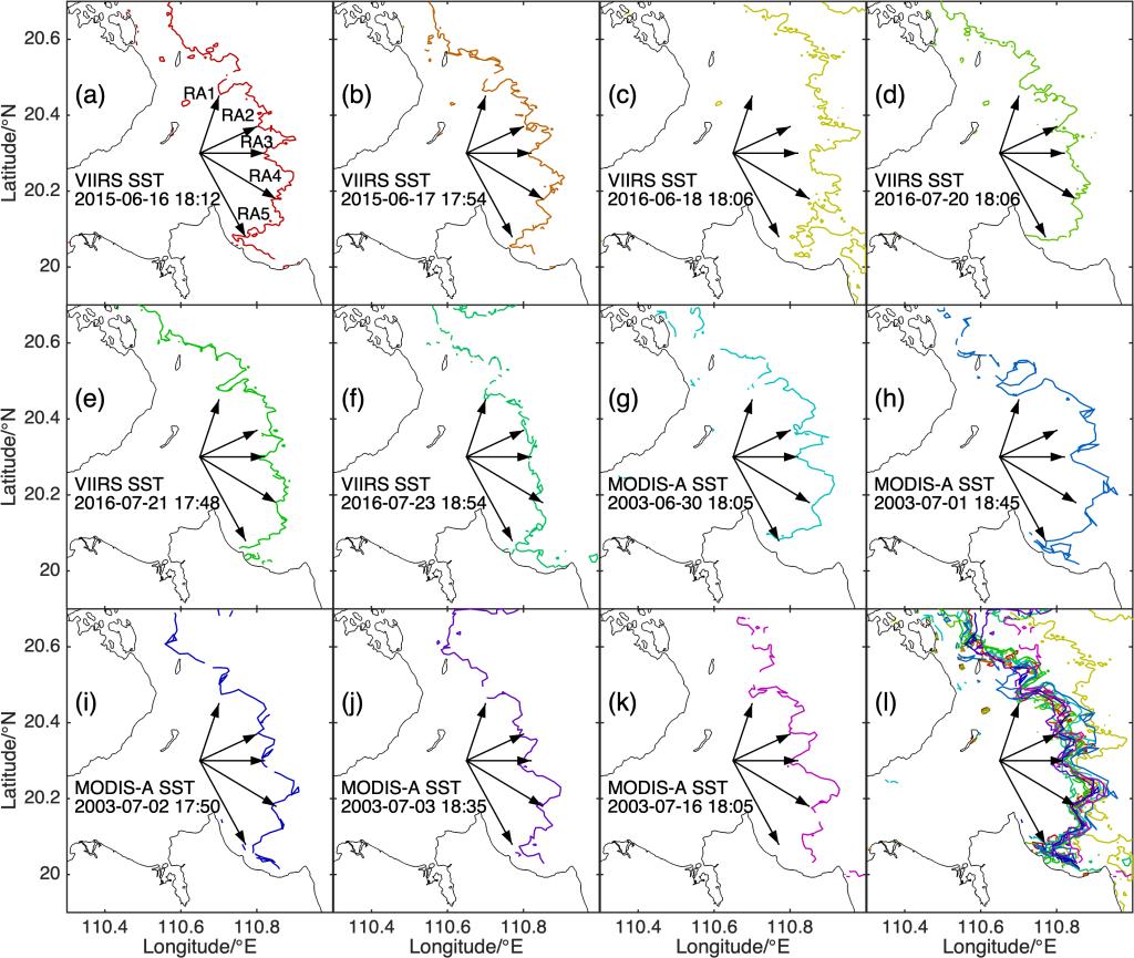 图1.琼州海峡东口处上升流致冷水区西侧外缘线位置:(a)–(f)提取自VIIRS Level-2SST数据;(g)–(k)基于MODIS Level-2 SST产品;(a)–(h)中冷水区外缘线的叠加展示于(l)。注:由于上升流在不同时间其强度动态变化,冷水区外缘线的提取基于不同温度值的等温线,(a)–(h)中所用等温线温度值依次为28.6, 28.5, 28.5, 28.5, 28.5, 28.3, 28.7, 27.5, 27.8, 27.2, 27.2℃。