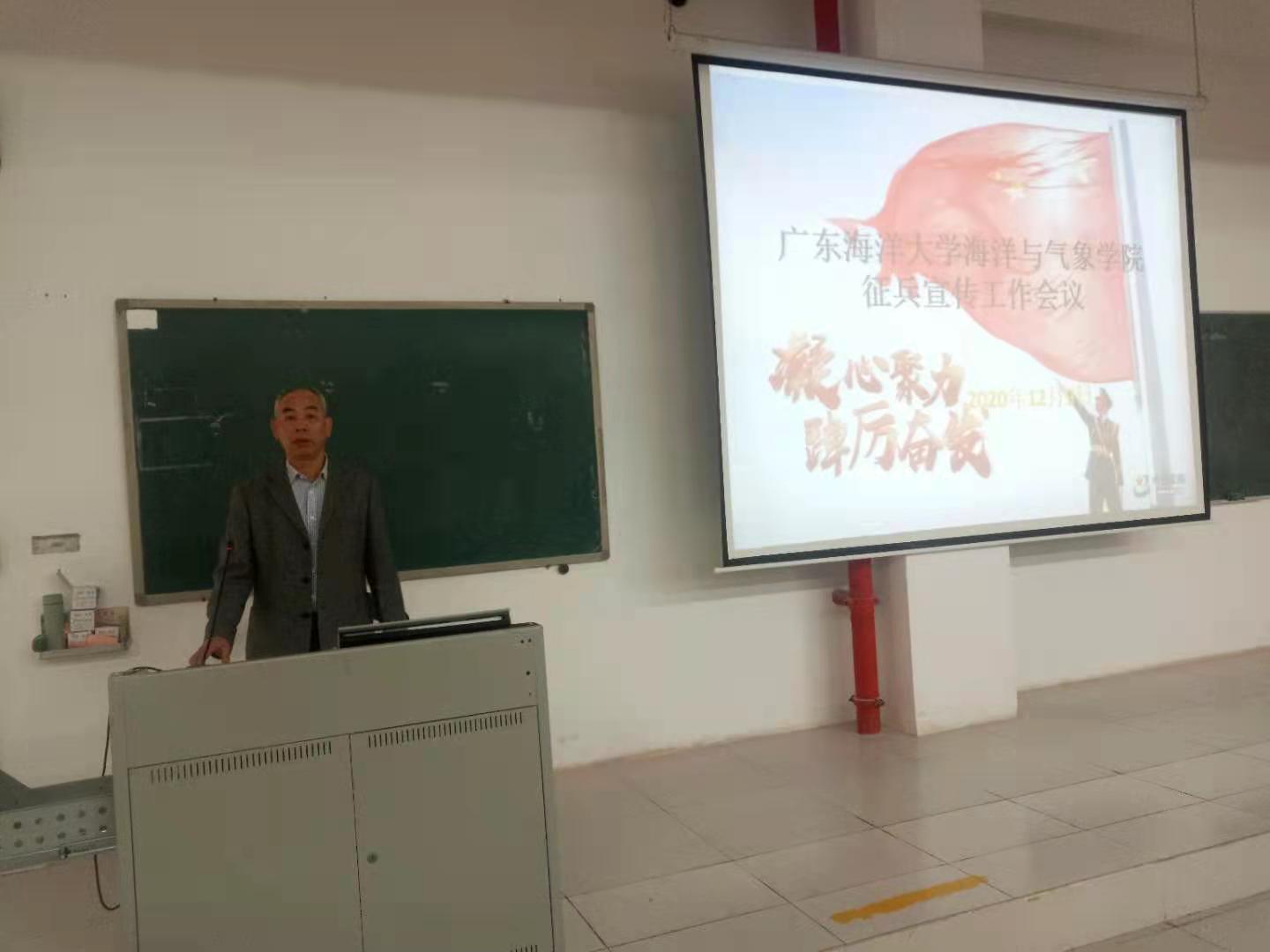 在学校征兵宣传月中,学院积极营造浓厚宣传氛围,采用线上线下相结合的方式,在海洋科技楼的电子屏幕中播放宣传标语,在班级微信群发放征兵资料和公布全国征兵网的网址链接;以退伍的员工为主组建征兵宣队伍,积极以“征兵和国防教育报告会”“先进典型事迹宣讲会”的形式,用身边人讲述身边故事,用身边事带动身边人,鼓励和引导更多老员工参军入伍。