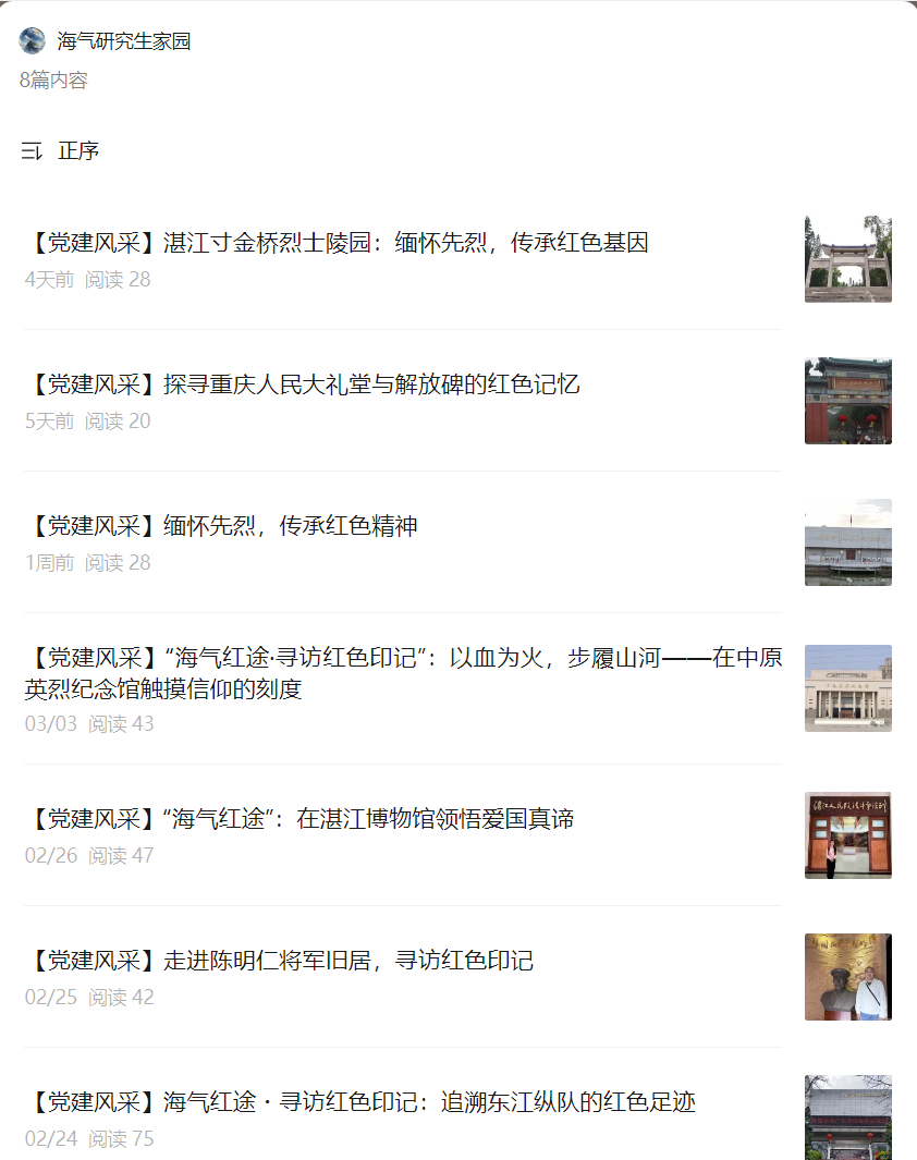 走访过程中,党员们通过拍照、笔记等方式,详细记录红色基地现状与背后的革命故事,并在支部内部积极分享个人感悟。这些走访实录和真情实感的分享,以新闻稿形式在 “海气研究生家园” 公众号陆续发布,向更多人传递红色基因与革命精神,扩大了活动影响力。
