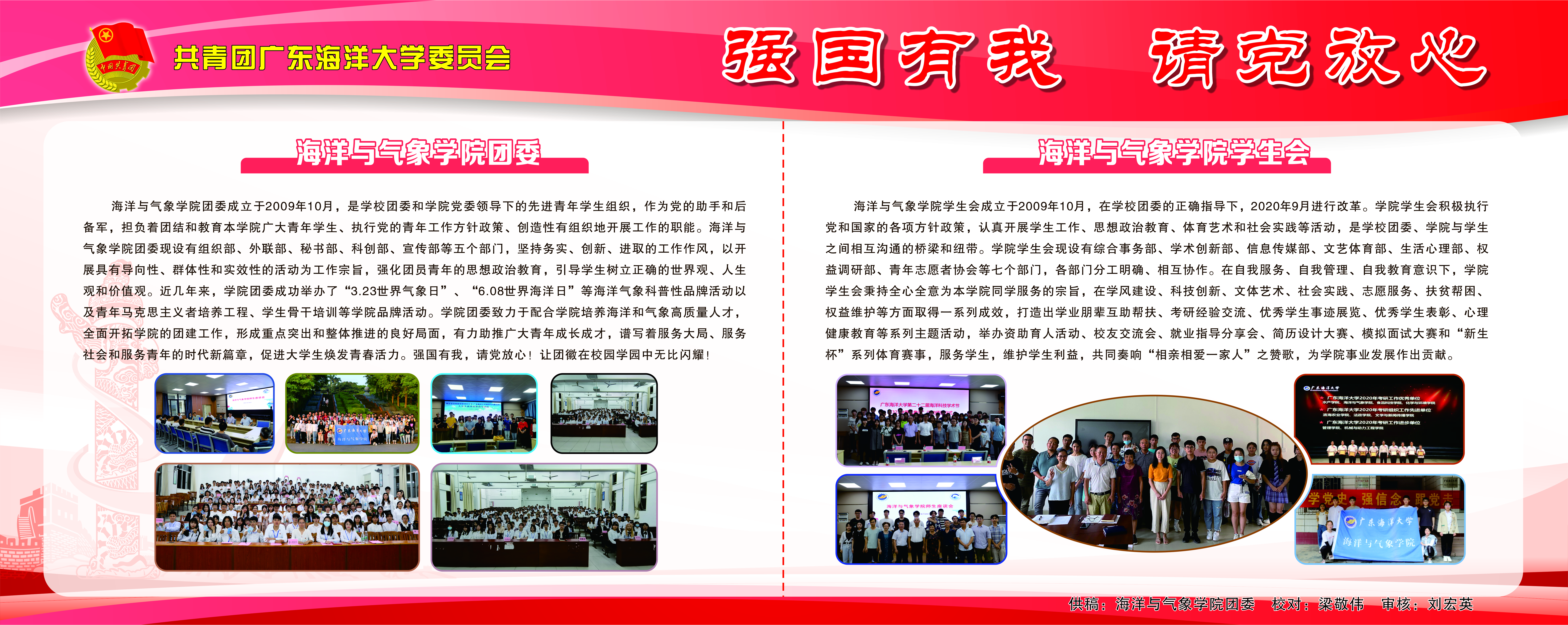 william威廉中文官网团委成立于2009年10月,是学校团委和公司党委领导下的先进青年员工组织,作为党的助手和后备军,担负着团结和教育本学院广大青年员工、执行党的青年工作方针政策、创造性有组织地开展工作的职能。william威廉中文官网团委现设有组织部、外联部、秘书部、科创部、宣传部等五个部门,坚持务实、创新、进取的工作作风,以开展具有导向性、群体性和实效性的活动为工作宗旨,强化团员青年的思想政治教育,引导员工树立正确的世界观、人生观和价值观。近几年来,学院团委成功举办了“3.23世界气象日”、“6.08世界海洋日”等海洋气象科普性品牌活动以及青年马克思主义者培养工程、员工骨干培训等学院品牌活动。学院团委致力于配合学院培养海洋和气象高质量人才,全面开拓学院的团建工作,形成重点突出和整体推进的良好局面,有力助推广大青年成长成才,谱写着服务大局、服务社会和服务青年的时代新篇章,促进老员工焕发青春活力。强国有我,请党放心!让团徽在校园学园中无比闪耀!