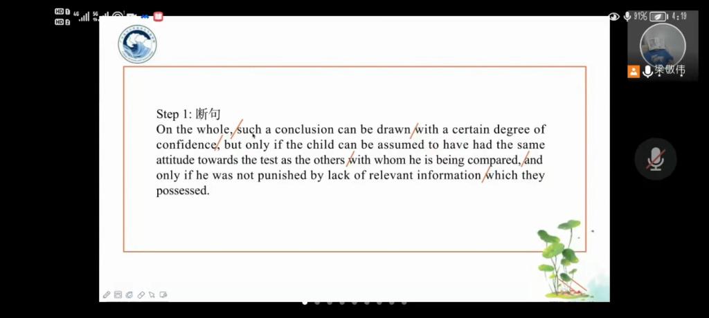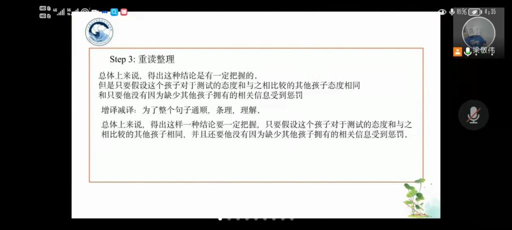 紧接着梁敬伟老师继续以启发式教学引导我们,提出“词组”或“句子”修饰“词”时该如何翻译,对于定语是前置翻译还是后置翻译的问题,引导我们进一步思考,加深了我们对定语在句中成分中的更深层次的理解,清晰地给同学们讲述翻译的具体步骤,断句、翻译、重读整理。