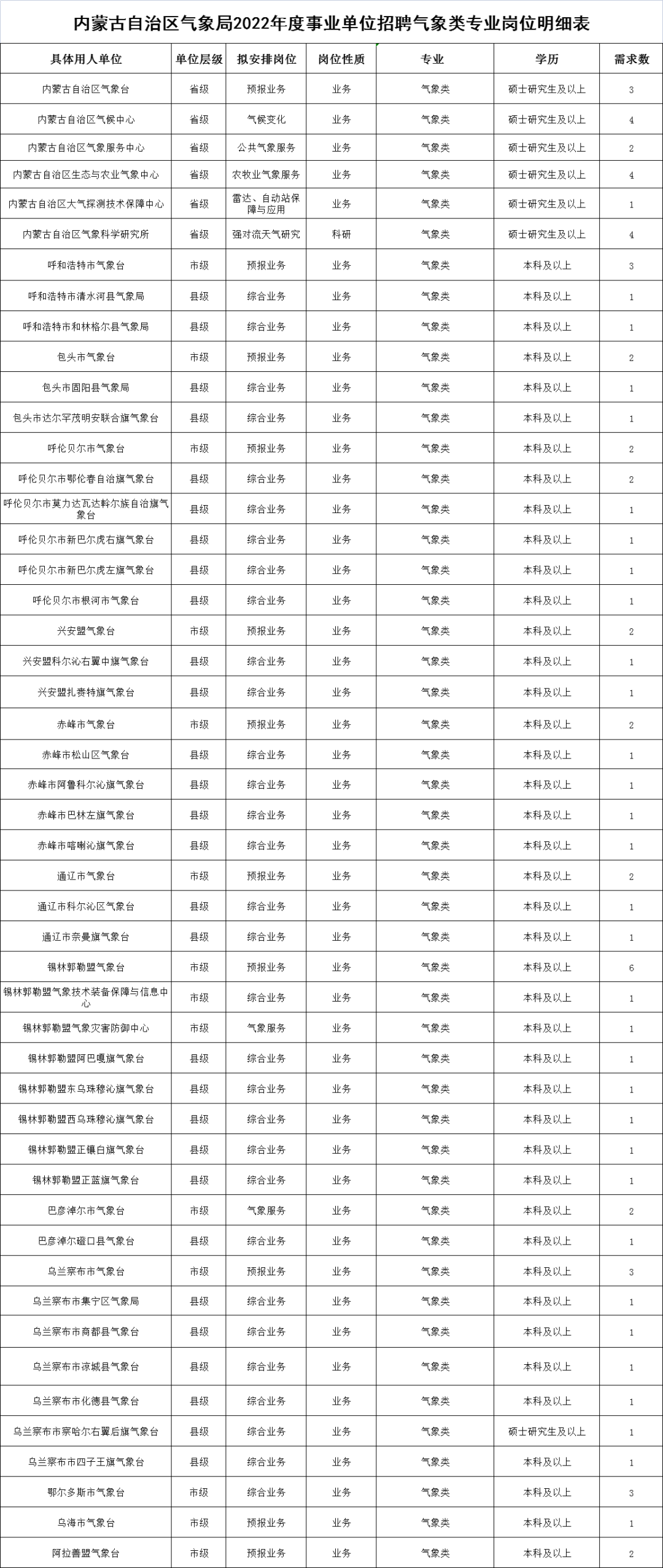 附件1.内蒙古自治区气象局2022年度事业单位招聘气象类专业岗位明细表