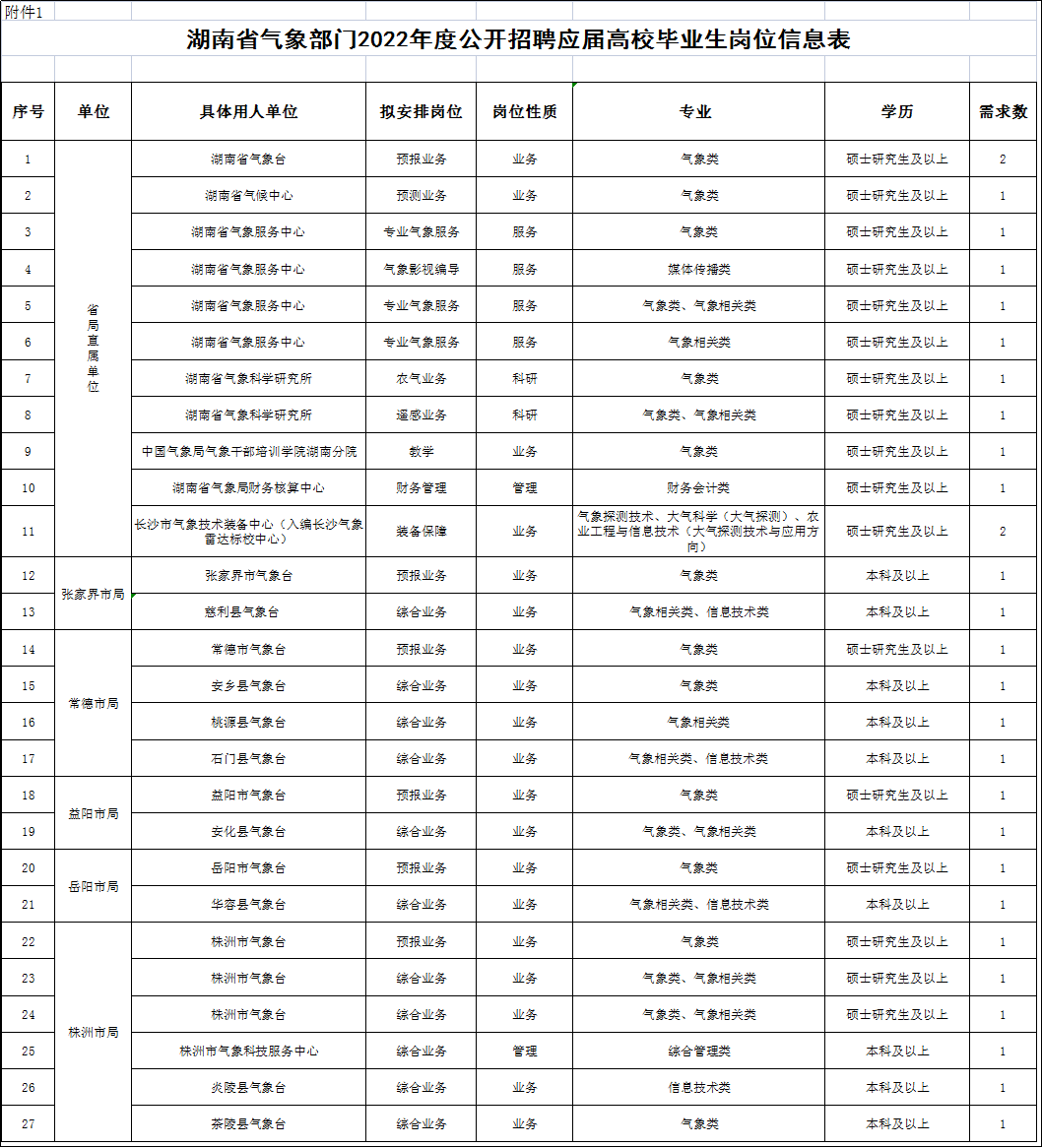 1.湖南省气象部门2022年度公开招聘应届高校毕业生岗位信息表.xls