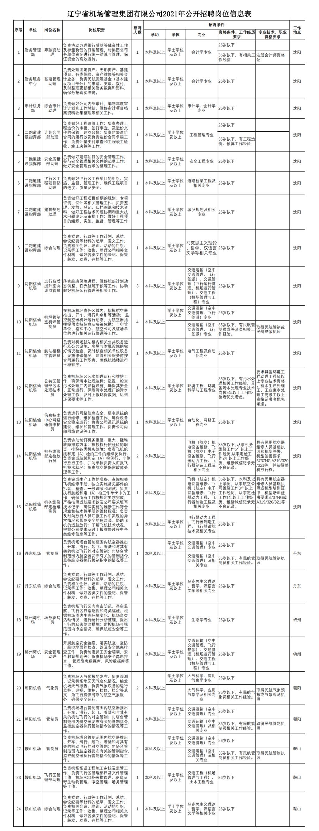 为满足公司高质量发展需要,辽宁省机场管理集团有限公司面向社会招聘33名工作人员(具体岗位详见附件),现公告如下: