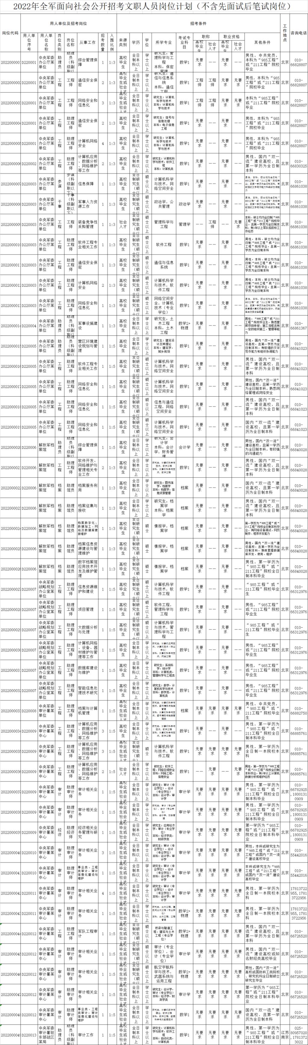 全军统一考试于2022年1月9日进行,内容包括公共科目和1门相应专业科目,主要考核报考人员的综合素质和专业基础。公共科目和专业科目考试大纲,可登录军队人才网浏览和下载。其中,专业科目考试大纲分为哲学、经济学、法学、教育学、文学、外国语言文学、历史学、理工学、农学、医学、图书档案学、艺术学、管理学等13类45个专业。对专业科目考试大纲没有覆盖的小语种和少数民族语言专业岗位,专业科目笔试按照相应语种语言本科公司产品大纲命题。