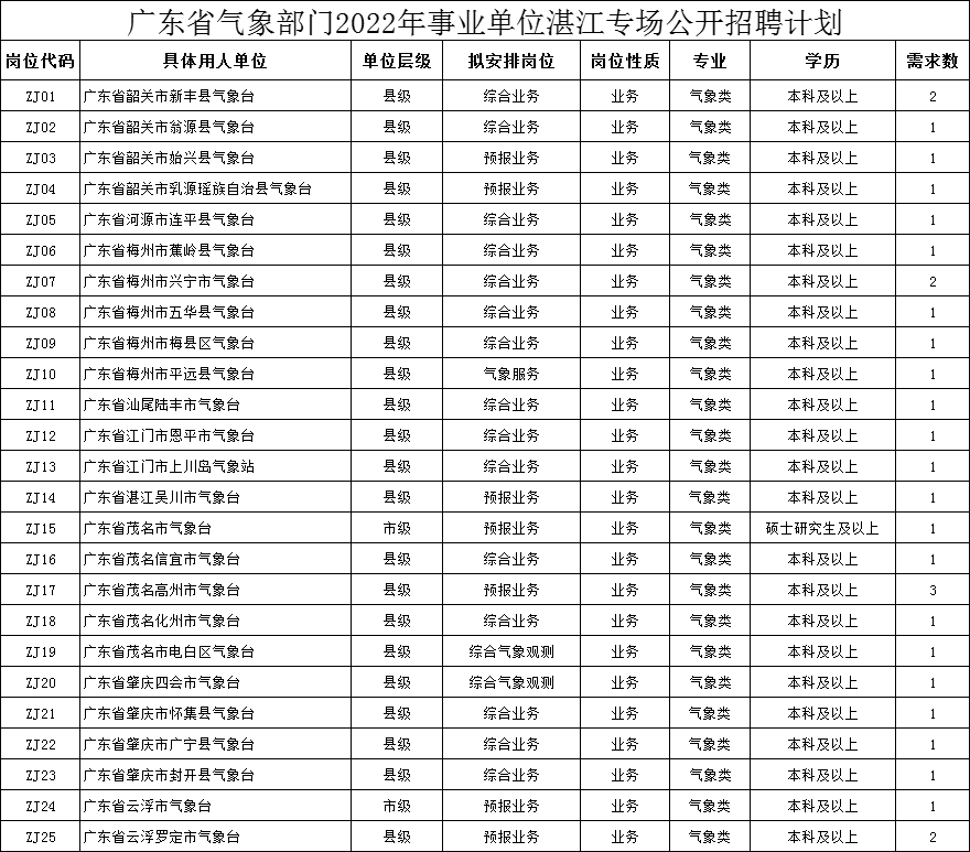 (一)招聘单位、招聘岗位:详见《广东省气象部门2022年湛江专场事业单位公开招聘计划》(附件1)。