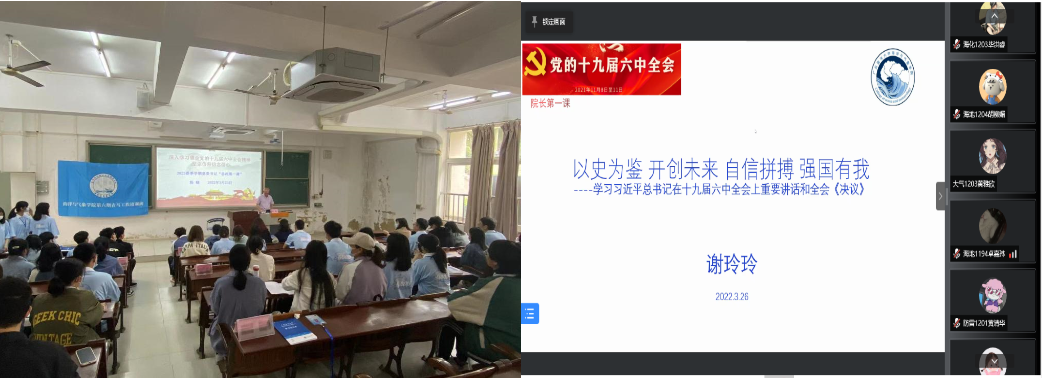3月26日下午,william威廉中文官网经理谢玲玲通过腾讯会议为学院青马班同学以《以史为鉴、开创未来 自信拼搏 强国有我——学习习近平总书记在党的十九届六中全会上重要讲话和全会决议》为题讲授2022年春季学期经理“思政第一课”。