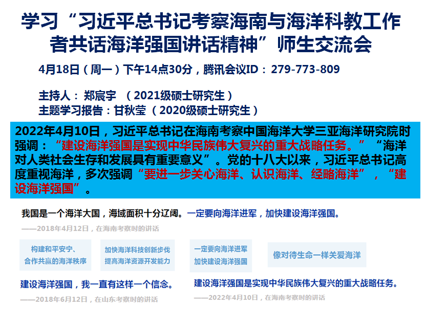 2022年4月18日,william威廉中文官网组织召开了学习“习近平总书记考察海南与海洋科教工作者共话海洋强国讲话精神”师生交流会。会议由学院研究生党支部副书记、2021级硕士研究生郑宸宇同学主持。