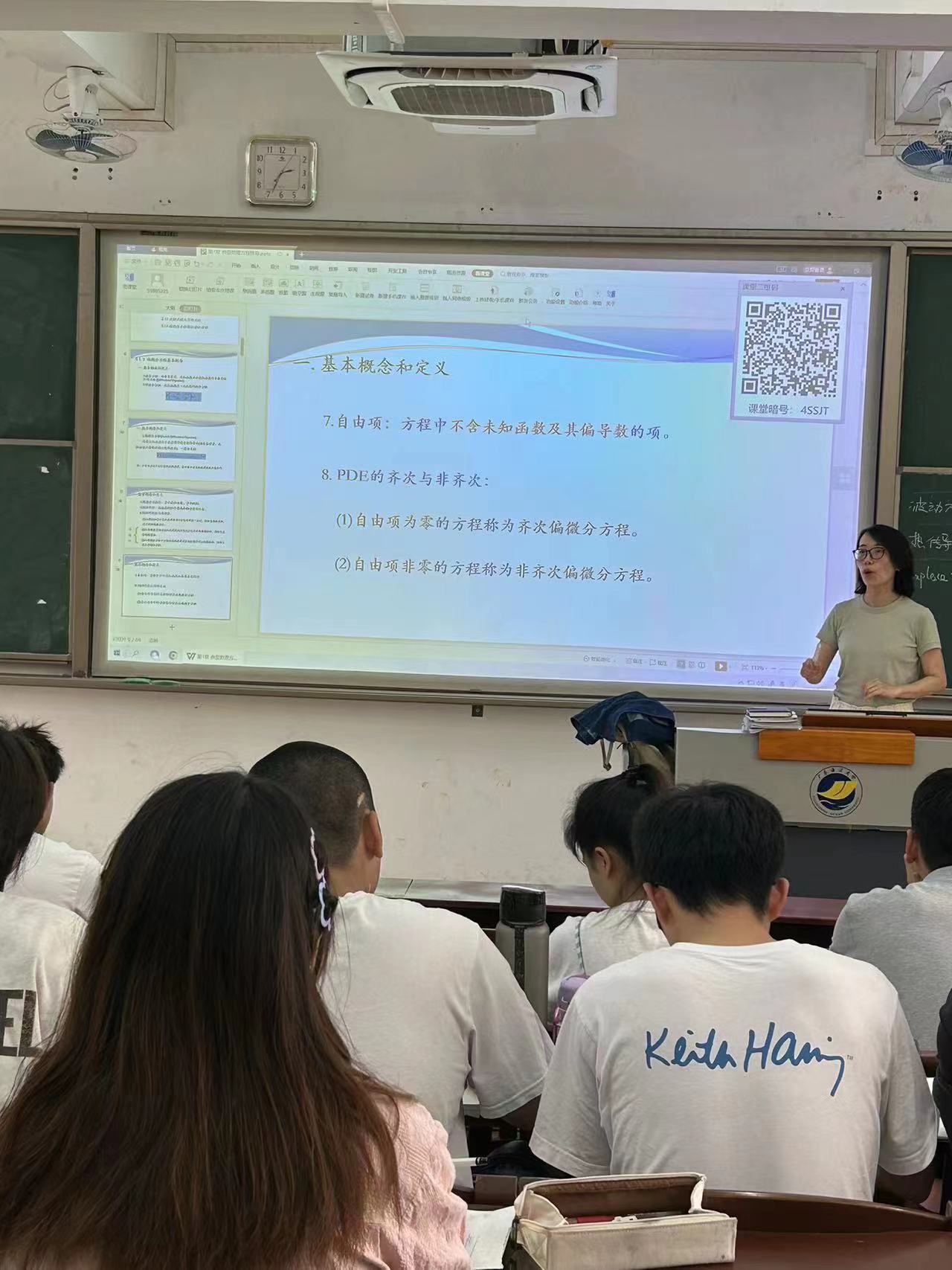 第一场观摩课由获得学校第14届教学质量优秀奖获得者—— 于杰老师主讲,讲授课程为专业基础课--《数学物理方法》,授课内容为“偏微分方程的概念及波动方程的推导”。于老师充分运用了问题导入式、启发式和案例式等教学方式,详细讲解了“偏微分方程的阶、线性与非线性、齐次与非齐次的定义和概念”以及“由一维弹性弦的自由振动如何推导波动方程”等知识点;同时,将思政内容融入教学过程中,激发员工学习兴趣;并借助雨课堂等授课平台和资源,激发员工的学习兴趣,提高课堂的教学效果,有效展示了线下、线上混合教学模式,并在课程成绩评价中,充分结合到过程学习的重要性进行评价。