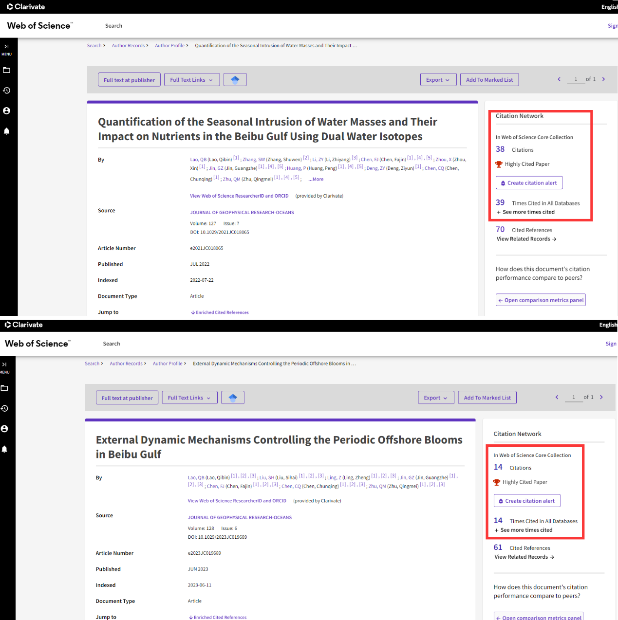 近日,据科睿唯安基本科学指标数据库(Essential Science Indicators,简称ESI)最新数据显示,公司海洋科学学科2篇论文Quantification of the seasonal intrusion of water masses and their impact on nutrients in the Beibu Gulf using dual water isotopes”(Lao et al., 2022, Journal of Geophysical Research: Oceans)和External dynamic mechanisms controlling the periodic offshore blooms in Beibu Gulf”(Lao et al., 2023, Journal of Geophysical Research: Oceans入选ESI全球前1%高被引论文(图1实现公司海洋科学领域研究的重要突破。这两篇论文的第一作者均为博士研究生劳齐斌,陈法锦教授为唯一通讯作者。