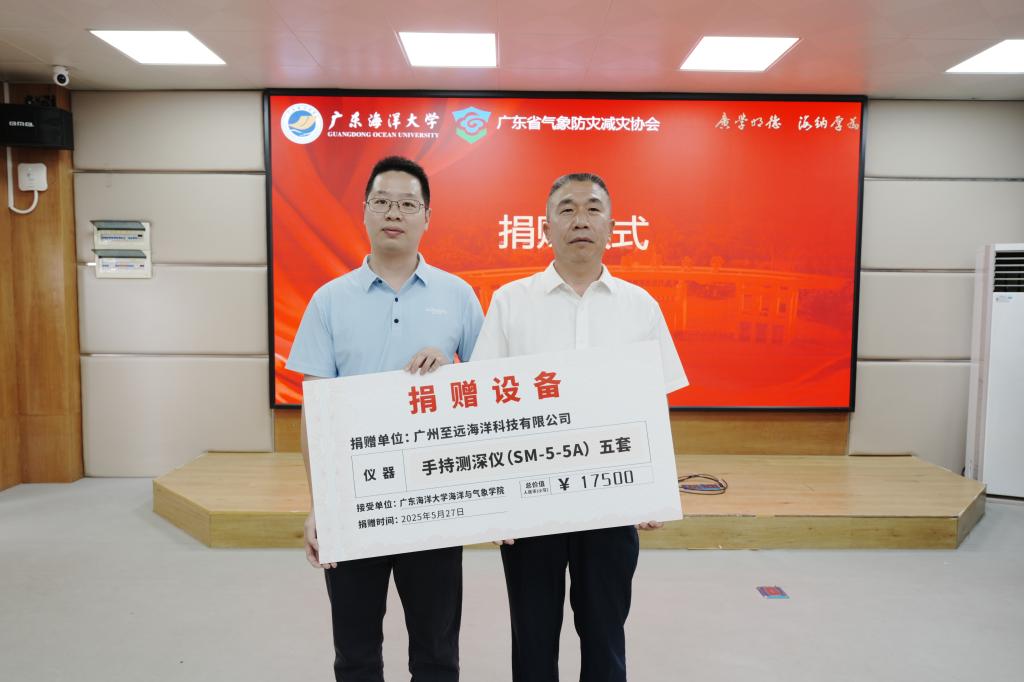 活动现场还举行了捐赠仪式,部分员工和社会企业慷慨解囊,为学校、学院建设和发展贡献力量。员工代表陈俊旺先生等人捐赠学校 10 万元,广州至远海洋科技有限公司捐赠手持测深仪(SM-5-5A)五套,总价值1.75万元。本次捐赠不仅为学院教学科研提供了有力支持,更彰显了海大人“感恩、奉献、传承”的精神品格。