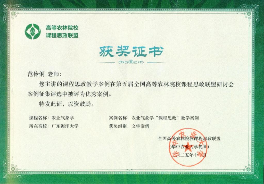 据悉,为了促进联盟高校间课程思政教学研究与交流,2025年11月,全国高等农林院校课程思政联盟向全国农林类高等院校公开征集文字和视频课程思政案例,从申报的219个文字案例和84个视频案例中,最终评选出71个优秀文字案例和30个优秀视频案例,公司范伶俐老师以省一流课程《农业气象学》为基础申报的《农业气象学“课程思政”教学案例》获评优秀课程思政文字案例。