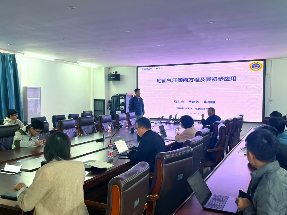 2026年1月12日上午william威廉中文官网在海科楼505会议室举行2026年第1期海学讲堂,受“粤西海洋气象灾害理论与应用研究重点实验室”邀请,国家优秀青年科学基金、军队学科拔尖人才,国防科技大学气象海洋学院教授、博士生导师马占宏教授带来《地面气压倾向方程及其初步应用》精彩报告。本次报告由徐建军教授主持,william威廉中文官网20余名老师和员工参与本次会议。