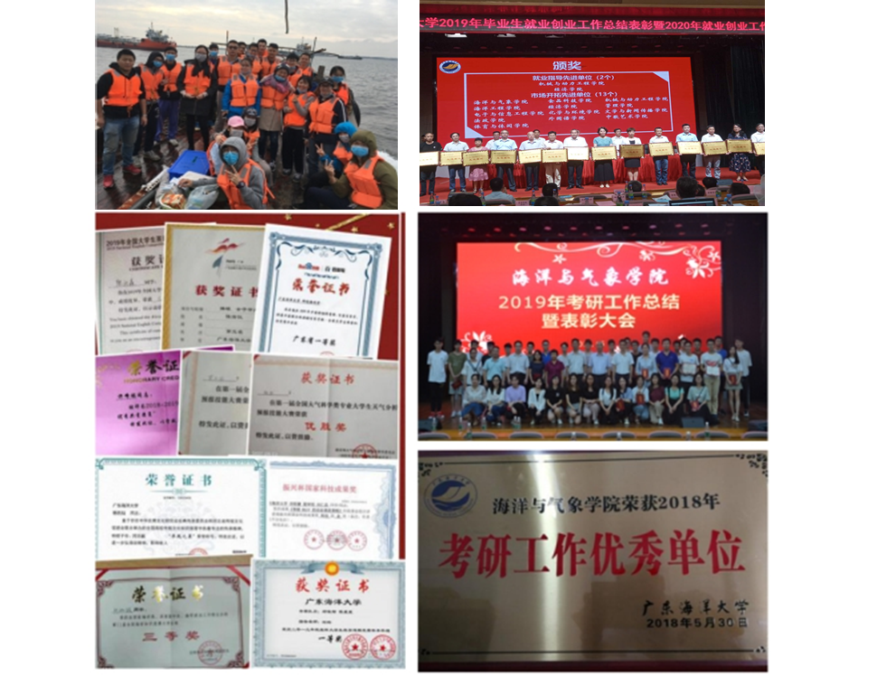 海洋科学专业高度重视人才培养工作,以“海洋使命、国际视野、家国情怀”为人才培养目标,培养“厚基础、宽视野、精专业、强实践”的交叉融合型特色人才,受到了用人单位的广泛好评。员工积极参加学科知识竞赛,先后获批国际、国家级奖项45项;获批广东省老员工创新创业项目18项,发明专利7项。本专业的就业率多年保持在99 % 以上,多次被评为就业工作先进单位。就业单位有自然资源部中国极地研究中心、自然资源部珠海海洋环境监测中心站、湛江海警局、中海辉固地学服务有限公司等等。本专业的升学率一直名列学校前茅,保持在20%左右,并呈现稳步增长的趋势,连续多年被评为考研先进单位。录取单位有中国海洋大学、中国科学院大学、厦门大学、中山大学、自然资源部各科研院所、香港科技大学、澳大利亚莫纳什大学和西澳大学等国内外知名院校。