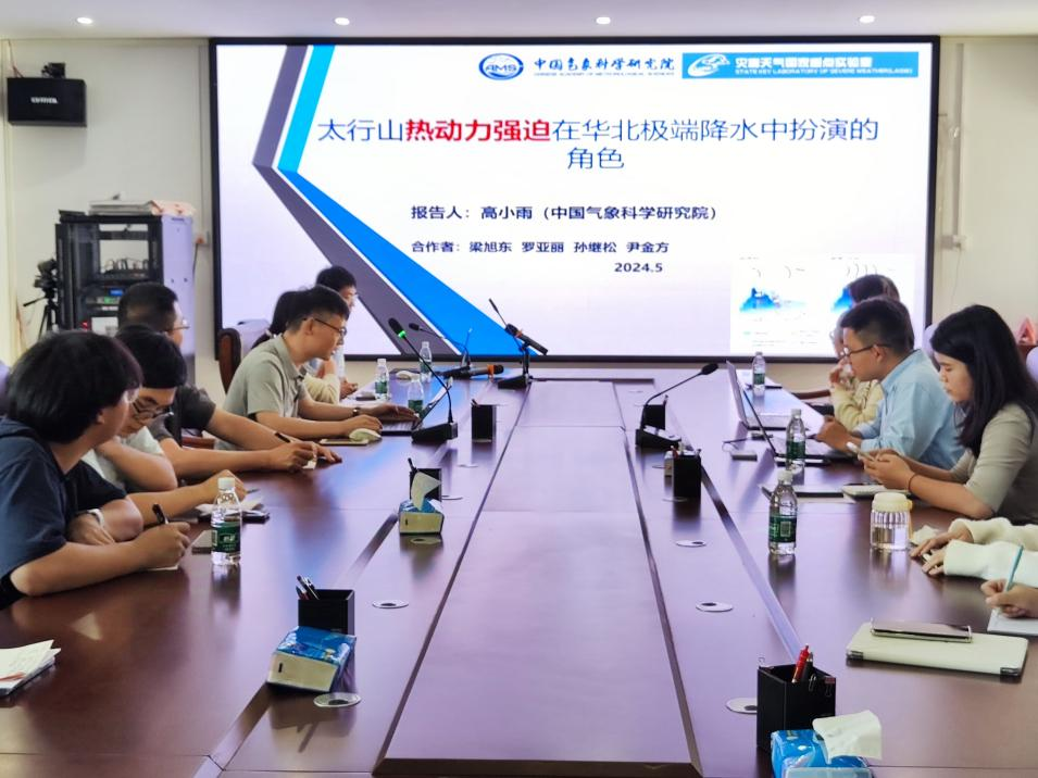 高小雨老师汇报的主题为 太行山热力强迫在华北极端降水中扮演的角色,分为个例分析,统计研究,华北暴雨综合科学实验三部分。从华北特大暴雨事件入手,进一步引入地形效应对雷暴降水的影响等研究内容。此外,研究小组在阳台山进行了暴雨观测,包括表面观测,梯度观测,风廓线雷达观测等观测。报告还对河南新乡极端小时降水作了细致讲解。最后高老师着重介绍了华北暴雨综合科学实验。