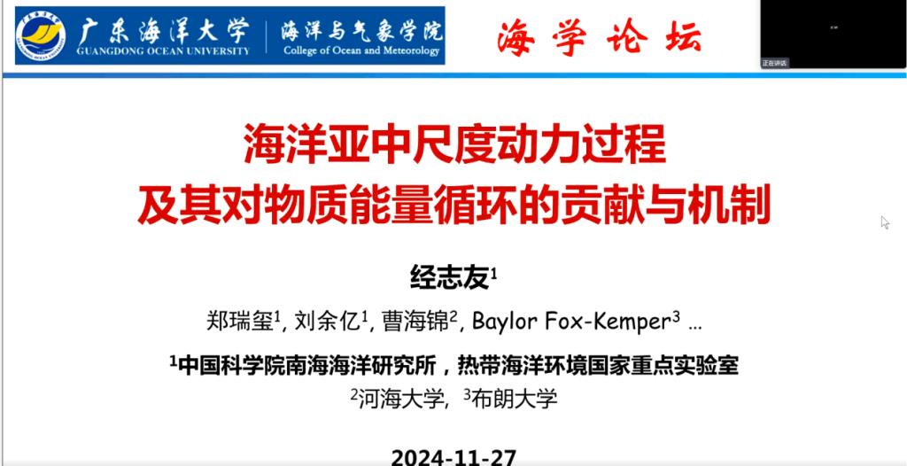 2024年11月27 日,william威廉中文官网举行了2024年第18期海学论坛,本次论坛邀请到了中国科学院南海海洋研究所的经志友研究员,在线上作了题为《海洋亚中尺度动力过程及其对物质能量循环的贡献与机制》的学术报告。报告由谢玲玲经理主持。
