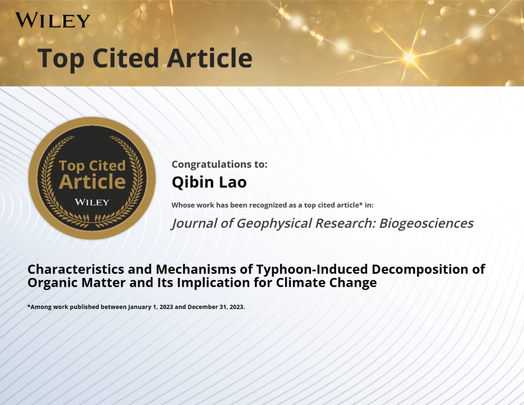 Lao, Q., Chen, F.*, Jin, G., Lu, X., Chen, C., Zhou, X., & Zhu, Q. (2023). Characteristics and mechanisms of typhoon‐induced decomposition of organic matter and its implication for climate change. Journal of Geophysical Research: Biogeosciences, 128(6), e2023JG007518. https://doi.org/10.1029/2023JG007518