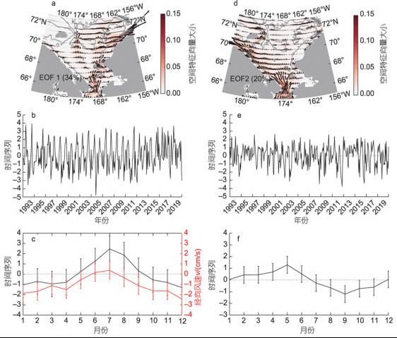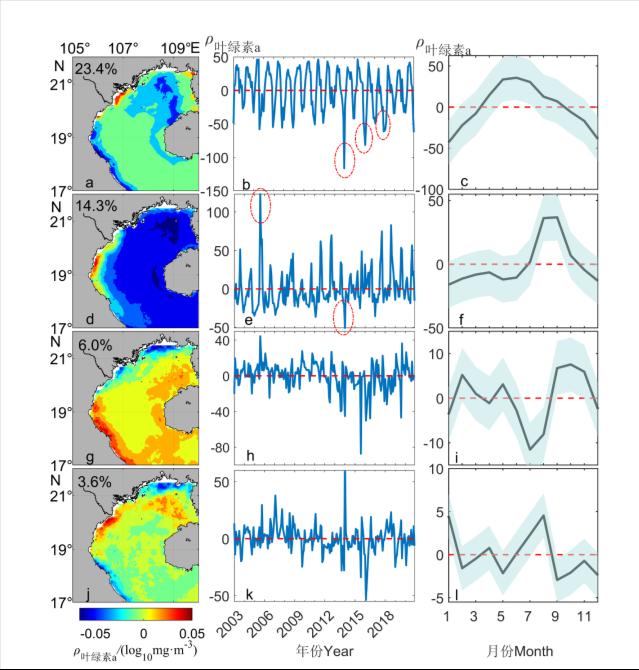图34.北部湾叶绿素a浓度前4个模态的EOF时空分布结果。a、d、g、j为EOF前四个模态的空间分布,其图中数字表示方差贡献率;b、e、h、k为时间序列,其中红色虚线圈出年份为极值年份;c、f、i、l为气候 态月平均量值。
