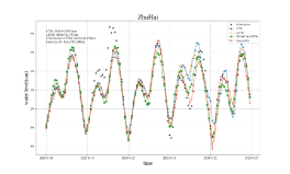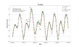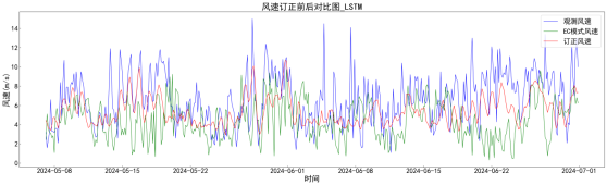 图41. LSTM神经网络模型订正风速结果图(蓝色为观测风速;绿色为模式风速;红色为订正后风速)