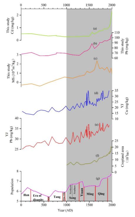 亚高山泥炭地对气候变化较为敏感,且受人类活动干扰较小,因此是重建古气候和人类活动的理想载体。为了更好的理解中国南方亚高山泥炭地十万古田(SWGT)全新世以来区域内环境变化与人类活动之间的相互关系(图43),本研究对SWGT泥炭地的δ13C、烧失量(LOI)、磁化率(MS)、化学风蚀指数(CIA)以及一些地球化学元素比值Al/K、Zr/Rb等多代用指标进行了气候变化和人类活动的分析。通过SWGT的各项指标结合区域内的相关记录进行分析,结果表明:在11600-9000 cal yr BP期间,东亚夏季风(EASM)较弱,气候相对干燥;在9000-4000 cal yr BP期间,EASM较强,气候较为湿润;在4000 cal yr BP以后,EASM变弱,气候又逐渐变得干燥。进一步的分析结果表明,在轨道时间尺度上,区域内的气候变化主要受到太阳辐射、高纬度冰盖面积、ITCZ移动和ENSO活动的影响。此外,近1000年以来,气候变化本身与泥炭地各项代用指标发生一定程度的解耦。此时SWGT泥炭地中MS以及重金属浓度的增加与湖南省人口增加是一致的,因此,可以推断此时人口的不断增长以及耕地和采矿的不断增加使得土壤侵蚀加剧和重金属含量增多(图44)。但是值得注意的是,可能受到海拔效应的影响,各项表示人类活动的指标表明在1000 AD以来人类活动才对该地产生显著影响(图44)。上述重建结果为将来进一步理解全新世气候变化与人类活动之间的相互作用和影响提供了基础性证据。