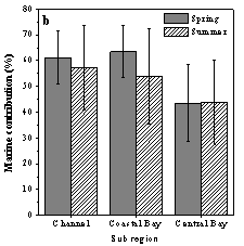 图2 春季和夏季湛江湾不同子区域陆源和海源有机质的输入比例