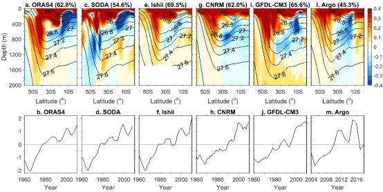 近年来,印度洋凭借其强大的吸热能力在调节全球气候方面扮演了极为重要的角色。但在垂向上,南印度洋热含量的长期变异趋势差异明显(图1)。表层普遍增暖,以40°S-50°S的南大洋增暖最为显著,可向下延伸到2000m,其次位于20°S-30°S的南印度洋,可向下延伸到超过400m。此外,南印度洋次表层广泛变冷,主要位于40°S以北。需要注意的是,在26.5σθ等密度面以上,~20°S以北的次表层海水变冷,以南的则变暖。