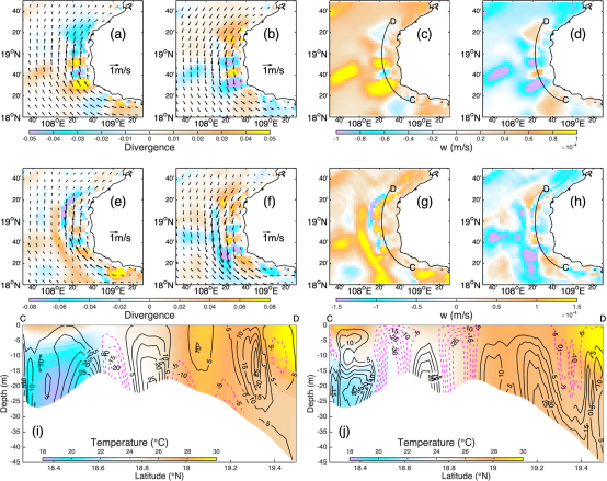 图1. 正压实验模拟的海南岛西侧海域涨潮流(a)及落潮流(b)期间深度平均的水平流场及其散度场,以及涨潮流(c)和落潮流(d)期间深度平均的垂向流速。(e),(f),(g)和(h)依次与(a),(b),(c)和(d)相同,但为斜压实验结果。断面CD上涨潮流(i)及落潮流(j)期间温度及垂向流速分布,图中黑色实线指示正(向上)垂向速度,紫色虚线标识负(向下)垂向速度,绘图时垂向速度量值放大1000倍。