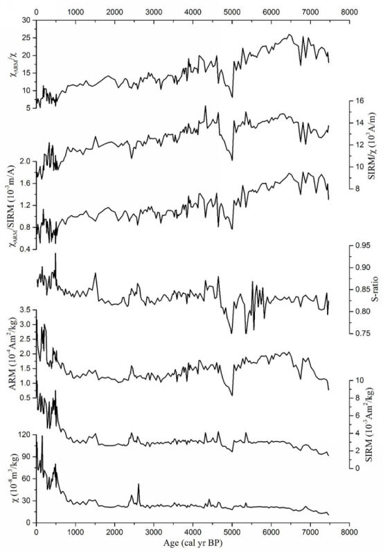 公司海洋地质团队成员黄超利用采自南海北部大陆架粤西泥质区的YJ Core岩芯做为研究对象(图1),通过210Pb和AMS 14C两种测年方法建立YJ Core岩芯的年龄–深度模式,开展系统的环境磁学研究工作,分析研究区沉积物的磁性参数的变化特征,并探讨研究区沉积物磁性特征的环境意义。该研究获取了研究区域过去7500年以来的高分辨环境磁学记录。研究表明YJ Core岩芯沉积物中的磁性矿物为碎屑成因,磁性矿物主要是磁铁矿,同时也含有少量的赤铁矿(图2)。YJ Core岩芯沉积物中磁性特征对气候变化响应灵敏,记录了过去7500年以来东亚夏季风的演变历史(图3)。7500–6800 cal yr BP期间,成壤作用的环境磁学χARM/χ和χARM/SIRM比值都依然保持相对较高的值,反映强盛的东亚夏季风;6800–3500 cal yr BP期间,磁性矿物含量指标ARM和磁性矿物粒度指标χARM/χ和χARM/SIRM的含量相对较高,可能反映相对湿润的气候,进而可能指示该时期相对强盛的东亚夏季风;3500–2000 cal yr BP期间,ARM和χARM/χ和χARM/SIRM相对较低,表明东亚夏季风相对较弱;近2000年以来,由于人类活动逐渐增强,YJ Core岩芯沉积物环境磁学指标可能不仅仅受气候变化的控制,而且可能主要受到日益增强的人类活动的影响。